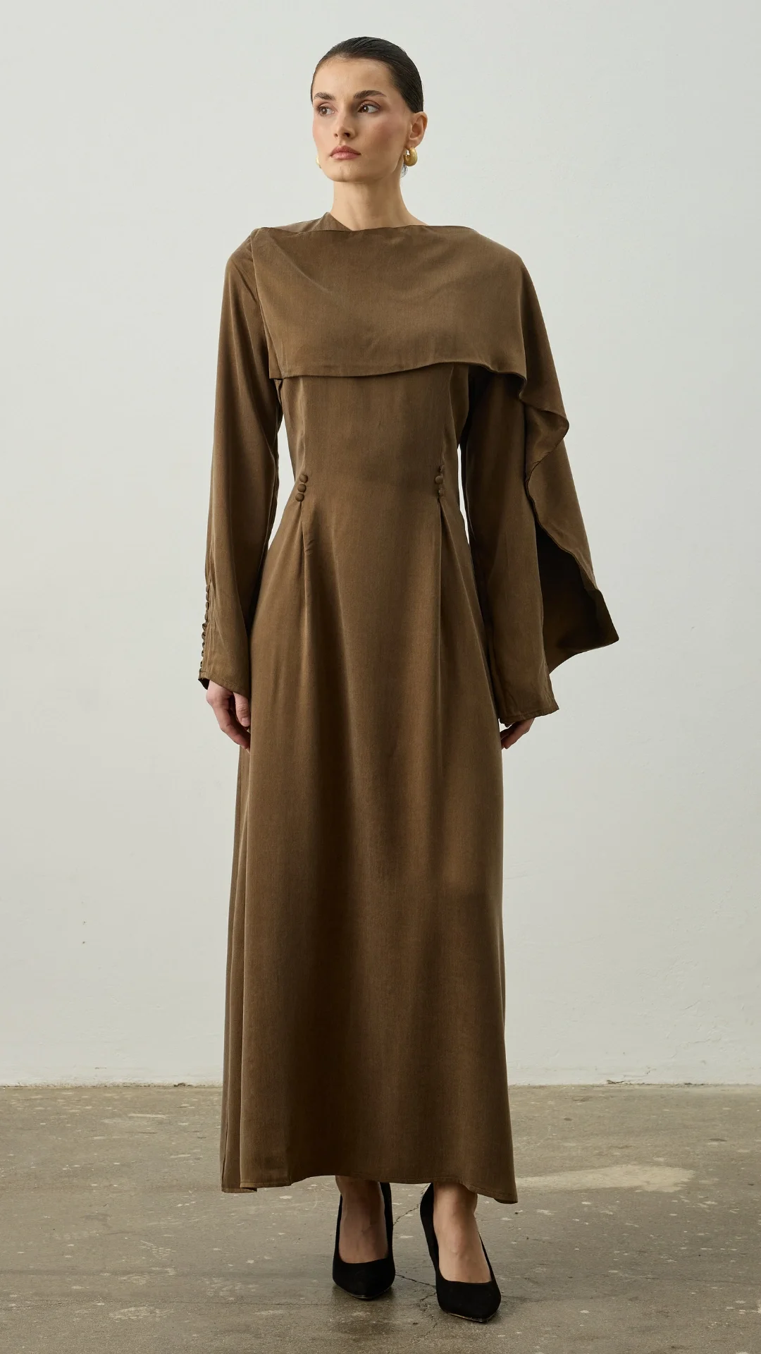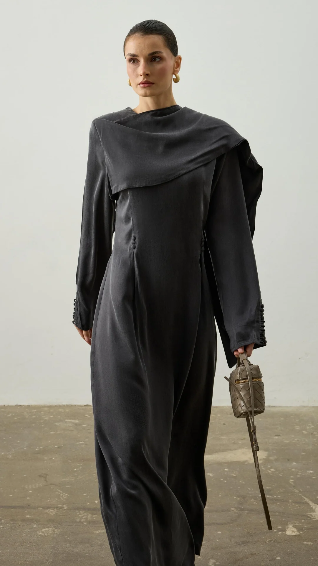 Omzu Şal Detaylı Cupro Elbise Mürdüm