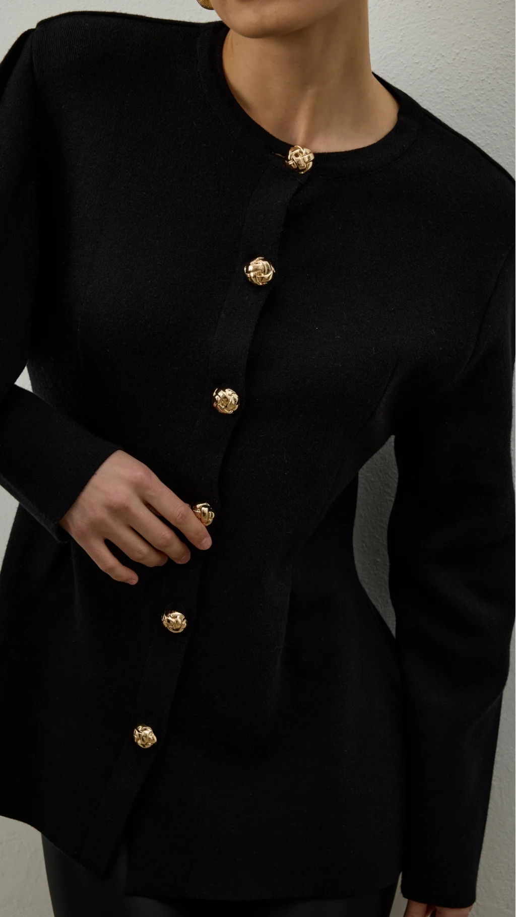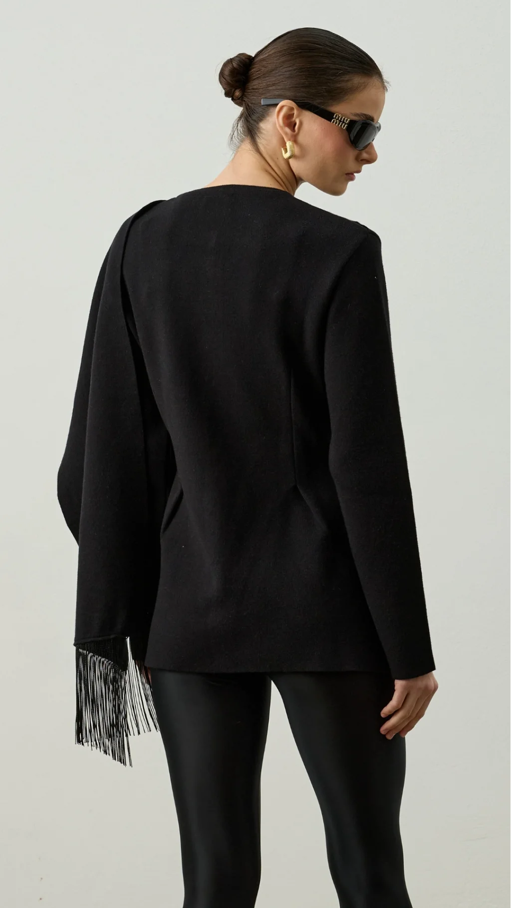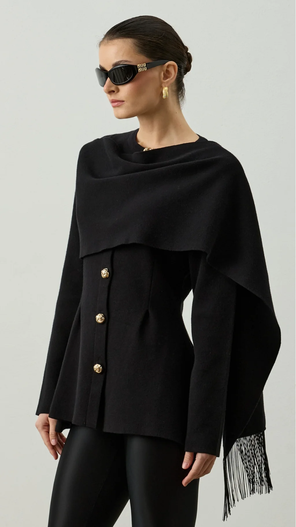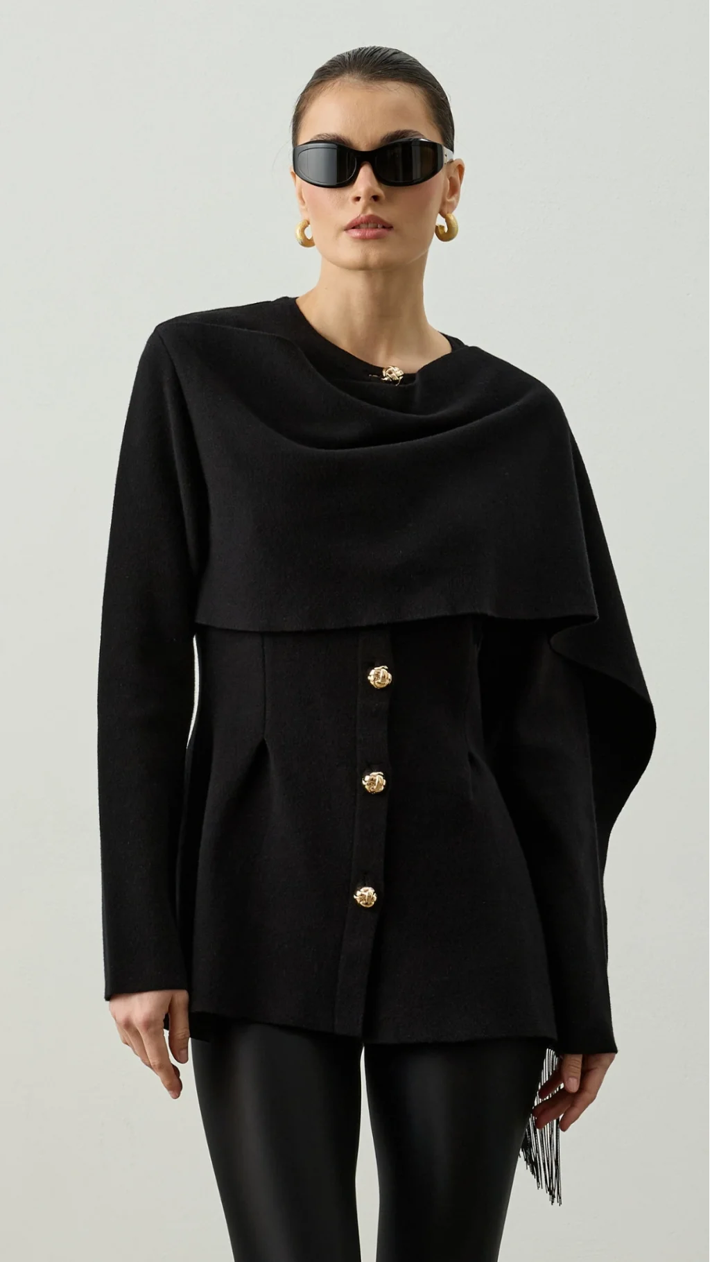 Omzu Püskül Şal Detaylı Triko Hırka - Siyah