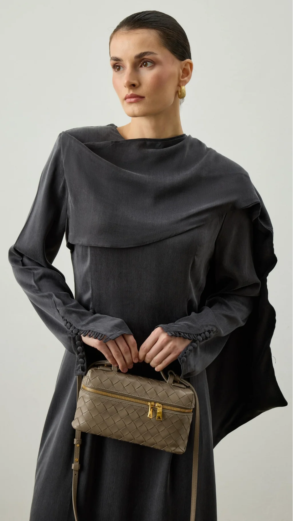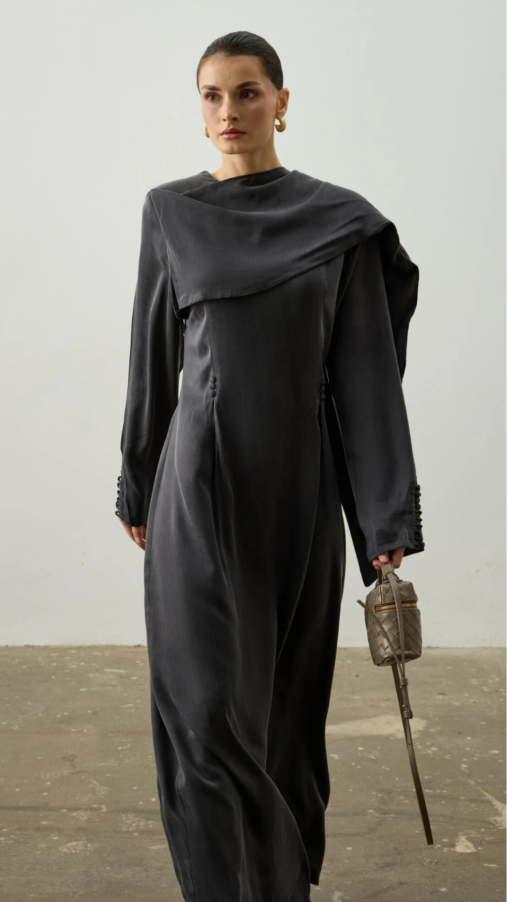 Omzu Şal Detaylı Cupro Elbise Antrasit